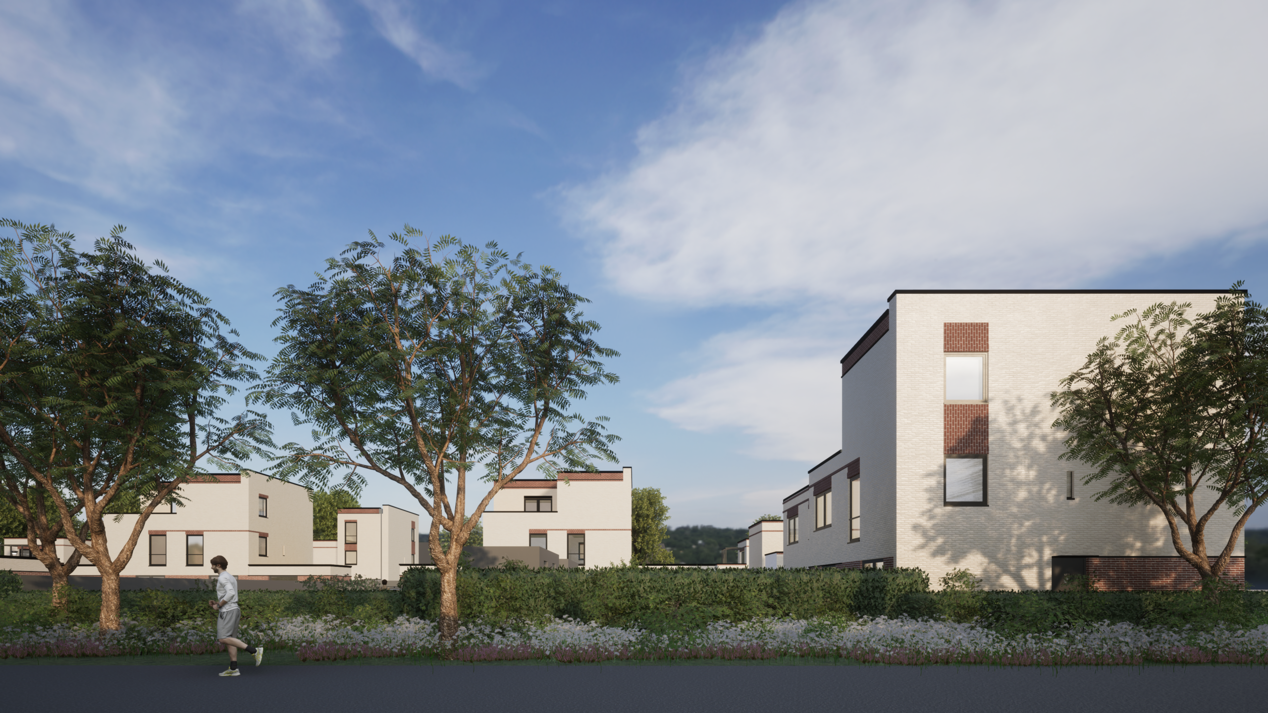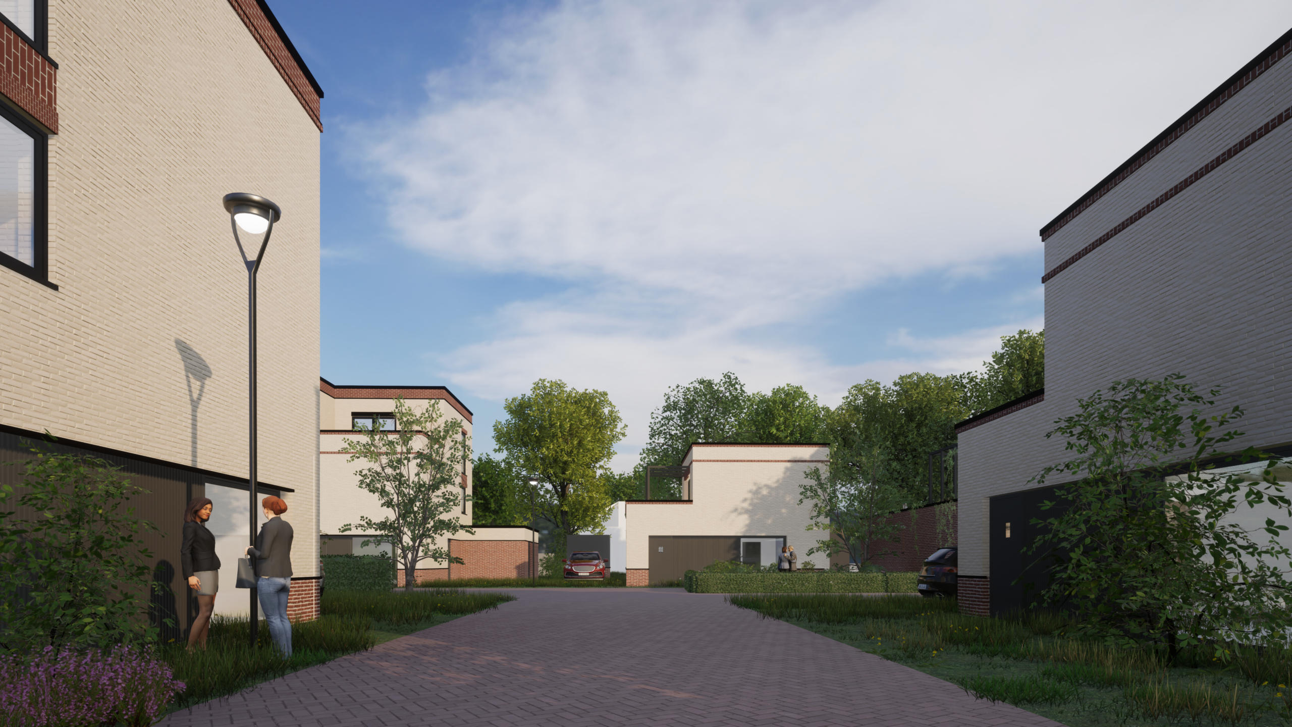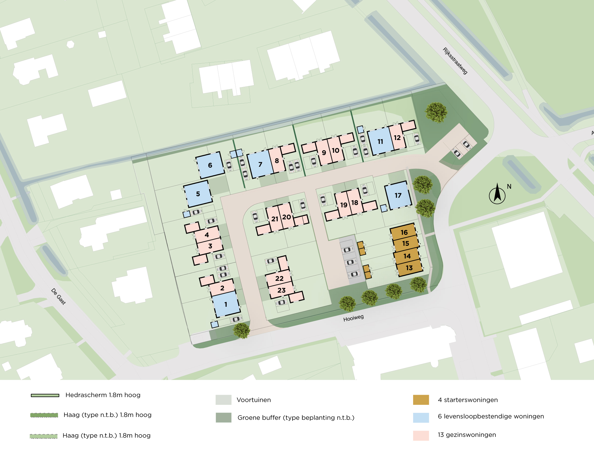 De architectuur is een eigentijdse vertaling van de karakteristieke woningen aan De Gast van architect Klaas Siekman. Lichte gevels, warmrode gemetselde plinten en kronen én zwarte details vormen het palet. De combinatie met strakke lijnen, speelse volumes en grote raampartijen geven de woningen een eigen uitstraling. De ruime woonkavels hebben eigen parkeervoorzieningen en liggen langs een overzichtelijke weg die aansluit op de Hooiweg. Het binnengebied krijgt door de warme bestrating en het gevelgroen een intieme centrumuitstraling met een gevoel van noaberschap.